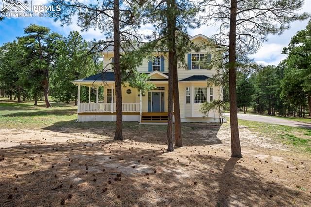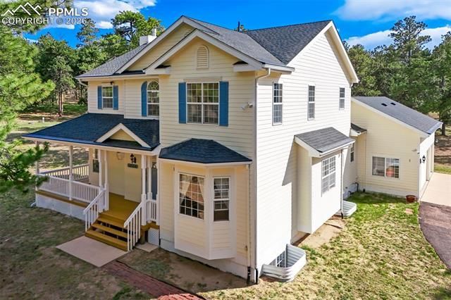 Timeless Victorian charm meets Colorado living in this beautifully situated Kings Deer residence. Nestled on a 2.5 acre treed lot, this traditional Victorian style home, complete with wrap around front porch, offers privacy, character, and room to breathe—all within one of the most desirable neighborhoods in northern El Paso County. Step inside to an inviting main level wrapped in rich hardwood floors, classic architectural details, and abundant natural light. The spacious kitchen and family room area (complete with gas fireplace), formal dining room, and dedicated home office create a functional layout ideal for everyday living. Upstairs, you’ll find four generously sized bedrooms, including a serene primary suite (2 walk in closets!) with views of the surrounding pines. The unfinished basement provides endless potential—additional bedrooms, a rec room, home gym, or storage—ready for your vision. Practical upgrades bring peace of mind: Two 50 gallon hot water heaters, new furnace, newer roof, new leach field and third septic tank, proper fire mitigation completed, Gutter Helmet system installed. A spacious 3 car garage offers plenty of room for vehicles, tools, and Colorado toys. Living in Kings Deer means enjoying a true Colorado lifestyle. The community features a golf course, sports field, playgrounds, and over 7 miles of maintained trails for walking, running, or wildlife watching. You may appreciate the highly regarded Lewis Palmer School District and will love being less than 10 minutes to I 25 or Highway 83—a rare blend of rural tranquility with quick access to Monument, Colorado Springs, and Castle Rock. A truly ideal rural setting with convenient access to city amenities—this Kings Deer Victorian offers the space, character, and lifestyle buyers dream of.