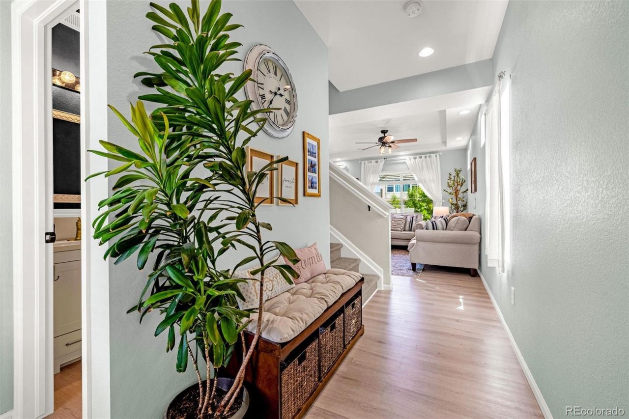 Walk through the front door and youre immediately welcomed by a space that feels open, bright, and elevated. 9ft ceilings draw your eyes upward, while an oversized window fills the living room with natural light. Whether relaxing or entertaining, the built-in surround sound system sets the tone.The upgraded chefs kitchen flows seamlessly from the living area, featuring stainless steel appliances, recessed lighting, and a spacious eat-in island that naturally becomes the gathering spot. LVP flooring runs throughout the main level, offering both style and durability. Just off the living space, a functional mudroom and access to the fully finished garage keep everyday life organized and efficient.Downstairs, the finished basement feels anything but below-grade. Vaulted ceilings, oversized windows, and updated lighting create a bright, inviting space with a second living area, private bedroom, updated bath with walk-in shower, and a dedicated office?perfect for guests, work, or a private retreat. Additional storage, a sump pump, and window well covers add peace of mind.Making your way upstairs, you will notice a thoughtfully designed layout. Two secondary bedrooms with walk-in closets share an oversized bath with a dedicated hallway linen closet, while the upstairs laundry room includes its own window for natural light and added storage for convenience. The oversized primary suite offers a quiet escape with a custom tile and rock walk-in shower, and walk-in closet. Outside, enjoy a freshly landscaped backyard, nearly new vinyl siding, and a custom concrete walkway that enhances curb appeal. A future community park, splash pad, and community hub at 47th & Telluride (coming 2027) adds long-term enjoyment to the neighborhood. A paid-off solar system, new roof and siding installed in 2025 with transferable warranties complete the package?delivering comfort, efficiency, and connection.